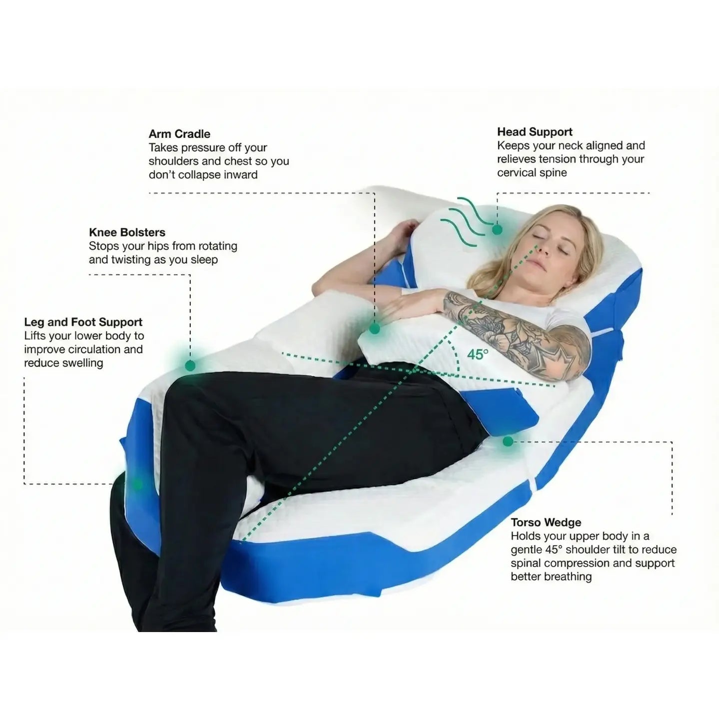 Angled corners allow the arm to rest beneath without altering pillow height, maintaining cervical alignment.