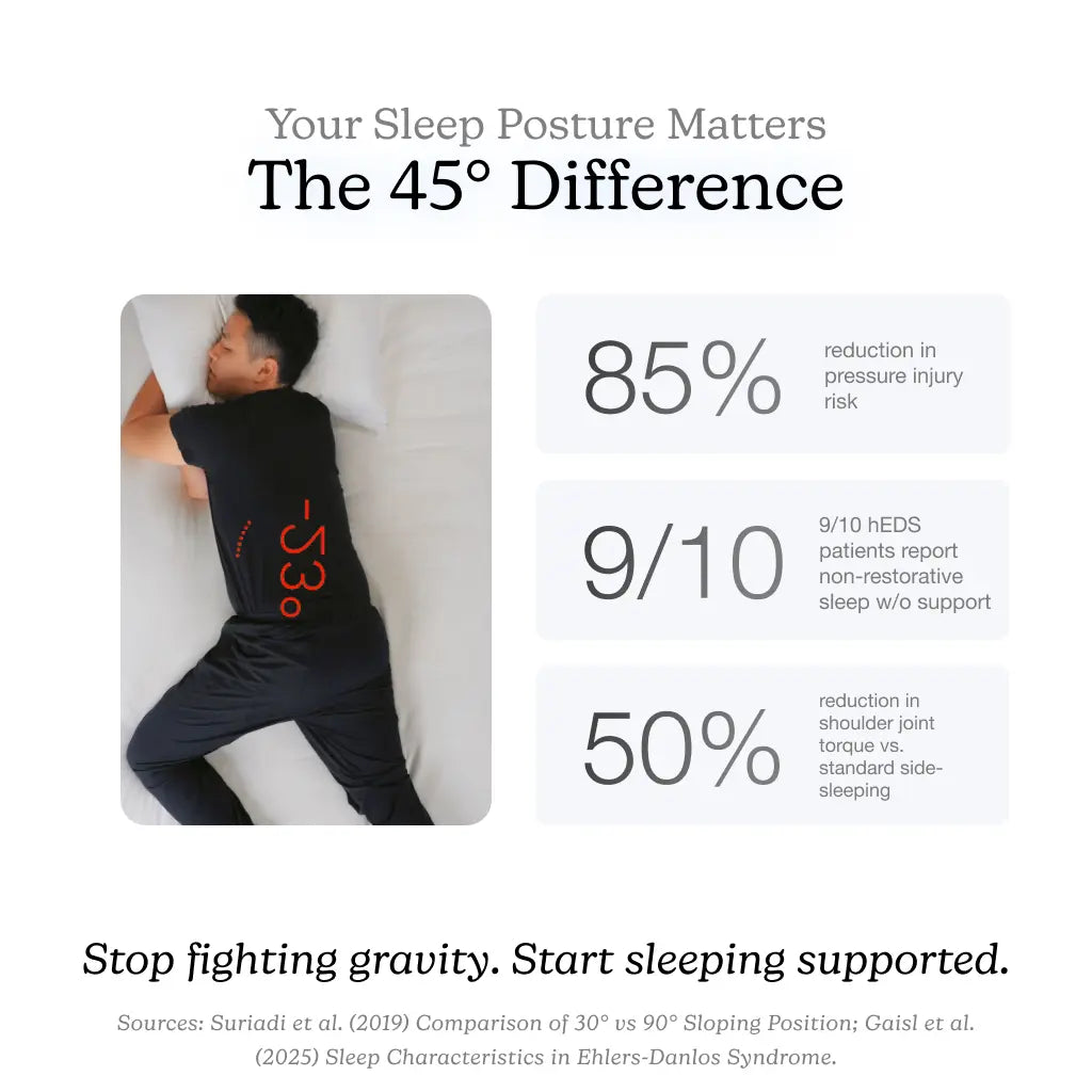 • In patients with Ehlers-Danlos Syndrome (EDS) or generalized hypermobility, the pillow stabilizes joints and minimizes the risk of subluxations or dislocations during sleep. By maintaining the spine, shoulders, and hips in neutral alignment, it decreases episodes of nocturnal pain associated with joint laxity and repetitive strain.